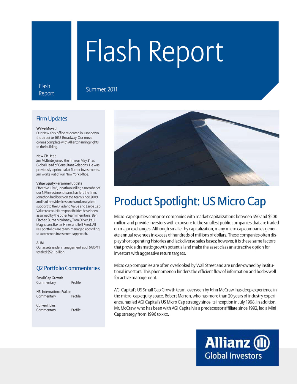 I spent a year as a design consultant for Allianz, Global Investors Corp, in the Institutional Marketing department. I produced financial reports, one-sheets, brochures and email blasts on a tight schedule, and updated dozens of reports for different products every quarter.
