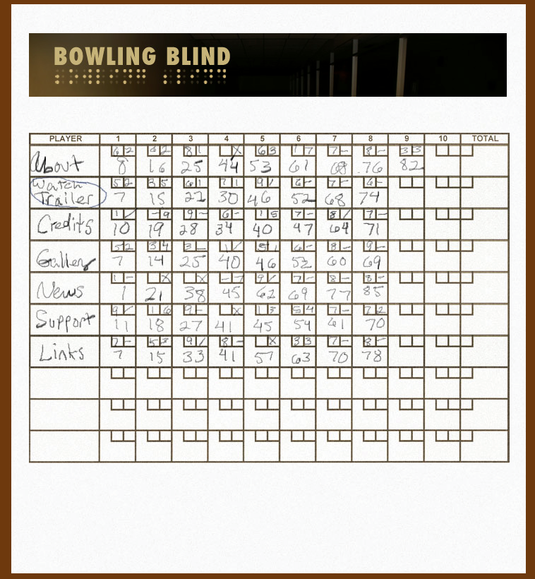 A simple but distinctive website for the short documentary Bowling Blind which follows a league of – you guessed it: blind bowlers! The landing page is a drop-down menu that looks like a score sheet.