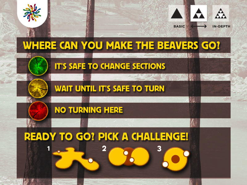 Interactive screen and attract-loop design for the MoMATH feature exhibit Beaver Run, where visitors are challenged to create a looping path for beavers to travel on.