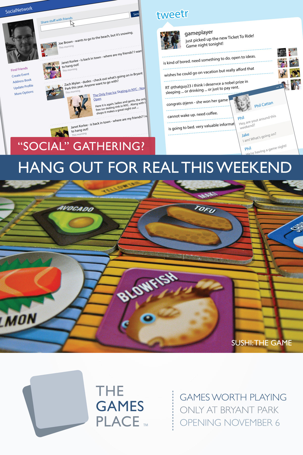 I worked with The Games Place, a startup boutique game shop, to develop their visual ID and marketing material. The challenge was to make board games “cool” and get people past notions of Monopoly and Uno. Think “Apple” branding for board games. Fun, but clean, modern and hip. I designed their logo, website, shop posters and advertisements.