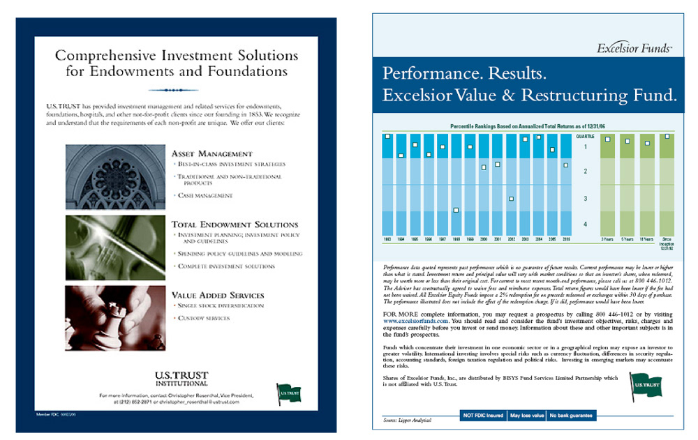 At U.S. Trust, I created ad campaigns for the Institutional Marketing group, which included Bank of America Private Wealth Management, Excelsior Funds. These ads usually ran in event programs, and newspapers.