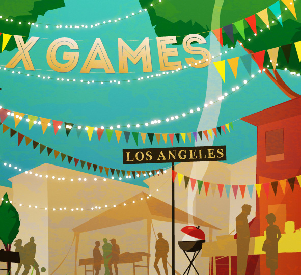 I designed a panoramic mural for the 2013 X Games press lounge. The theme of the the lounge was "block party." The scene is meant to feel both local and global, as if it could be happening in any of the cities hosting the X Games.